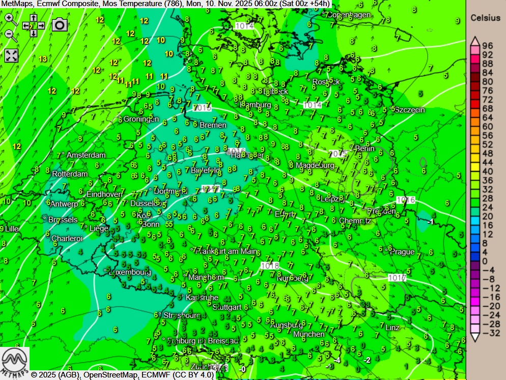 Am Montag zeigt sich der Himmel zunächst verbreitet stark bewölkt oder es ist nebelig-trüb. Im Tagesverlauf können die Wolken vor allem in der Westhälfte auch mal auflockern. Im Osten Deutschlands fällt zu Wochenbeginn zeitweise etwas Regen oder Sprühregen, sonst bleibt es am Montag weitgehend niederschlagsfrei.