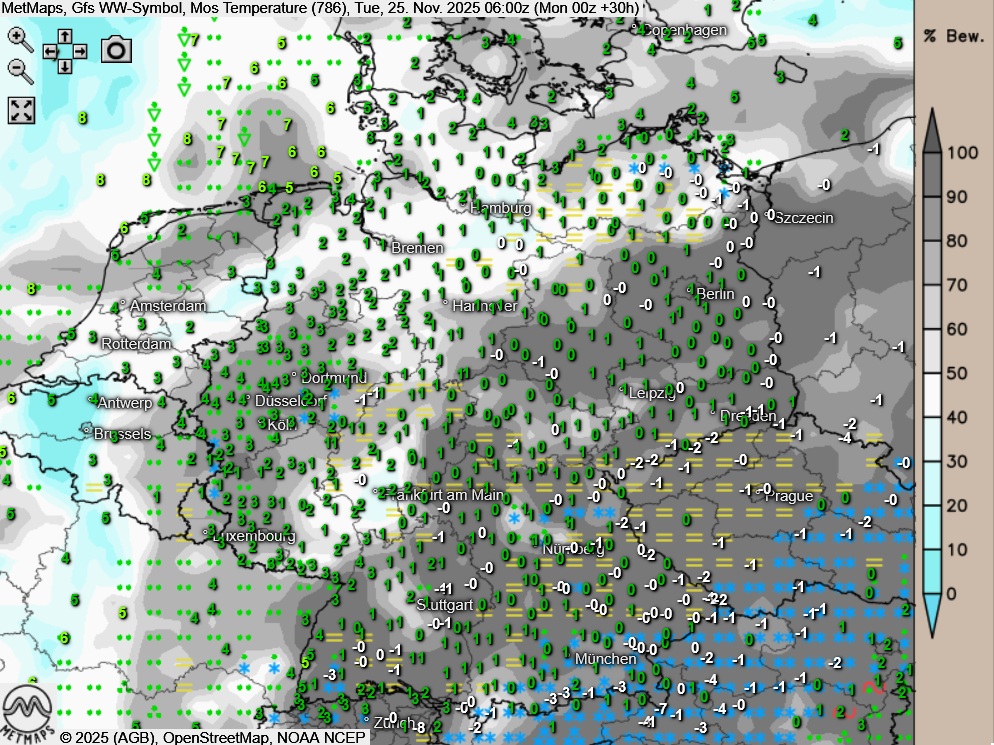 Die Wetter- / Temperaturkarte für Dienstagfrüh (06:00 Uhr) sowie die 24-Stunden-Regenmengen für Dienstag nach GFS: