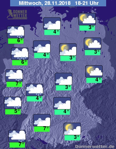 Am Abend fällt vom Emsland bis zum Oberrhein gelegentlich leichter Regen oder Sprühregen. Im übrigen Land ist es meist bewölkt aber trocken, nach Osten hin zeigen sich auch die Sterne.