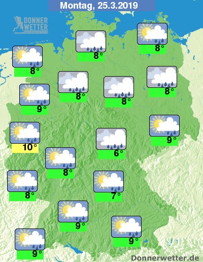 Zum Start in die neue Woche erwartet uns in Deutschland kühles und sehr wechselhaftes Wetter. Es bleibt meist stark bewölkt, hier und da zeigen sich Auflockerungen, dabei bilden sich wiederholt Schauer, teils auch mit Graupel und gewittrig. Die Temperatur erreicht nur 6 bis 10 Grad.