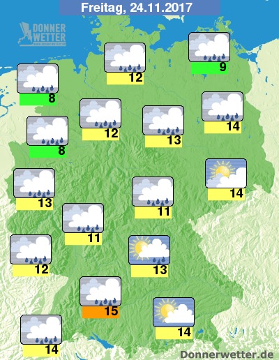 Ziehen von Westen dichtere Wolken mit zeitweiligem Regen oder Schauern übers Land. Am längsten freundlich und trocken bleibt es in der Südosthälfte. Auch im Nordwesten kann es am Nachmittag wieder gelegentlich die Sonne hervor kommen. Mit Temperaturen zwischen 10 und 17 Grad wird es insgesamt nochmals sehr mild. Lediglich im Nordwesten kühlt die Luft bereits ab, so dass sich die Temperaturen meist unterhalb der 10 Grad – Marke aufhalten. Der Süd- bis Südwestwind kann anfangs gebietsweise böig auffrischen, im Tagesverlauf beruhigt er sich aber.