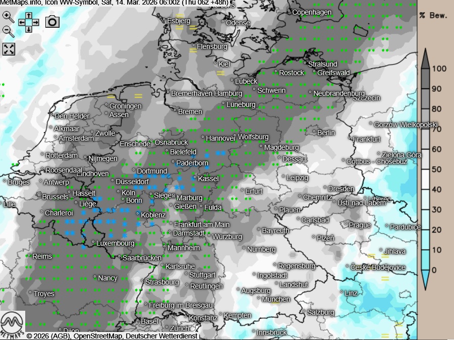 Am Samstag zeigt sich der Himmel über weiten Landesteilen stark bewölkt oder es ist bedeckt, dabei fällt zeit- und gebietsweise Regen, in den Mittelgebirgen auch Schneeregen oder Schnee. Lichtblicke gibt es am Samstag vor allem im Nordwesten.