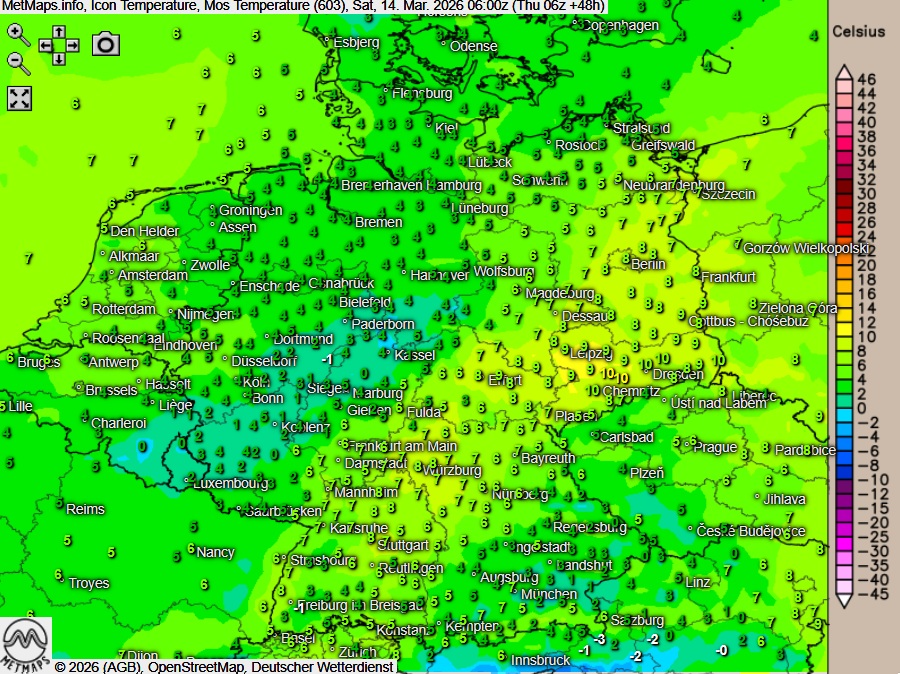 Die Temperaturen erreichen heute Höchstwerte um 5 Grad an der Ostseeküste und um 15 Grad im Osten Sachsens.