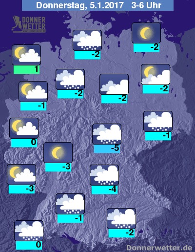 Mit frostigen Temperaturen, dafür aber meist trocken, treten wir am Donnerstag dann den Weg auf die Arbeit an. In der Nordhälfte ist es dabei überwiegend locker oder aufgelockert bewölkt, Schnee fällt zu diesem Zeitpunkt meist nur noch im Vogtland sowie im südlichen Baden-Württemberg und im Alpenvorland.