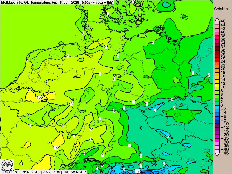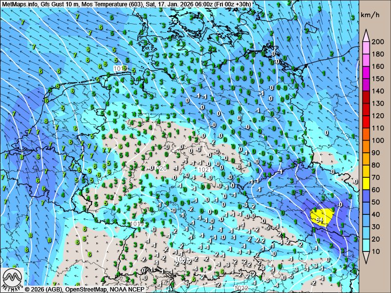 Die Lufttemperaturen und Wetterkarte für Freitagnachmittag (15:00 Uhr) sowie die Wind- / Temperaturkarte für Samstagfrüh (06:00 Uhr) nach GFS: