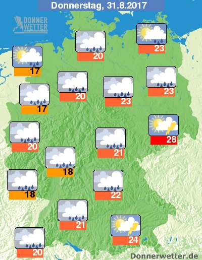 In der Südosthälfte unseres Landes muss bei dichter Bewölkung mit teilweise kräftigen Regenfällen gerechnet werden. Örtlich blitzt und donnert es auch dabei. Vor der Front können die Temperaturen im Osten nochmals auf sommerliche 25 bis 28 Grad klettern, mit dem Regen kühlt es aber auch hier spürbar ab.