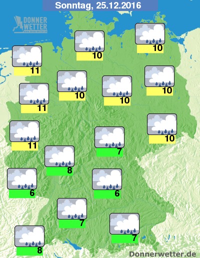 Der 1. Weihnachtsfeiertag fällt buchstäblich ins Wasser, denn bei dichter und dunkler Bewölkung fällt immer wieder, zum Teil auch langanhaltender und kräftiger Regen. Die Temperaturen sind zumindest ziemlich mild und liegen bei 6 Grad in Oberfranken und um 11 Grad am Niederrhein. Im Norden weht ein teils starker, an den deutschen Küsten ein teils stürmischer Wind.