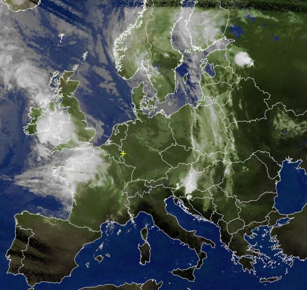 Auf dem Satellitenfoto von heute Morgen zeigen sich die kompakten Wolken zweier Tiefdruckgebiete bei Irland und über Skandinavien. Dabei fiel vor allem über dem Nordwesten Frankreichs verbreitet kräftiger und ergiebiger Regen.