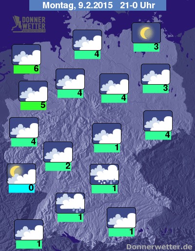 Heute Abend ist es verbreitet stark oder dicht bewölkt und es fällt hier und da auch etwas Regen oder Schneeregen, im Süden auch Schnee. Ein sternenklarer Himmel zeigt sich dagegen im Nordosten des Landes, hier bleibt es trocken. Die Abendtemperatur liegt bei 6 Grad entlang der Ems und 0 Grad am Pfälzer Wald.