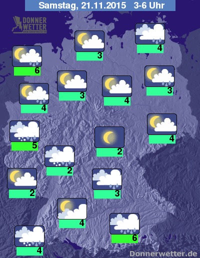 Am Samstag bleibt es vom Süden bis in die breite Mitte des Landes bei einer weitgehend verschlossenen Wolkendecke, dazu fällt besonders am Alpenrand, aber auch sonst zeitweise Regen oder Schneeregen, vor allem in höheren Lagen ist auch Schneefall möglich, dazu besteht erhöhte Glättegefahr. In Norddeutschland ist es oft stark, gelegentlich aber auch aufgelockert bewölkt, es bilden sich gebietsweise Schauer. Die Temperatur steigt auf 4 Grad im Saargau und bis 8 Grad in Stuttgart. An der Nordsee weht teils starker bis stürmischer Wind.