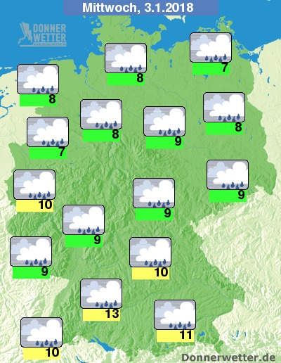 Am Mittwoch bleibt der Himmel bedeckt und es fällt immer wieder Regen, nach Süden hin auch vorübergehend Schneeregen oder Schnee. Die Temperatur steigt auf 7 bis 13 Grad, an der Nordsee herrscht zudem Sturm, aber auch in den übrigen Landesteilen weht der Wind teils stürmisch.