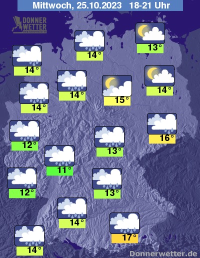 Heute Abend ist es im Nordosten anfangs noch teils locker bewölkt und trocken. Im übrigen Land ziehen dichte Wolken durch und es fällt zeitweise, teils auch kräftiger Regen. Die Temperatur liegt bei 11 Grad in Wiesbaden und 17 Grad in München.