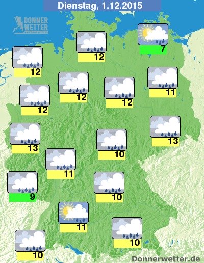 Am Dienstag ziehen verbreitet dichte Wolken übers Land. dabei ist es anfangs noch im Nordosten, im Nachmittagsverlauf auch im Südwesten weitgehend trocken. Sonst und im übrigen Bundesgebiet fällt aber vielerorts langanhaltender und teils ergiebiger Regen. Die Temperatur steigt auf 7 Grad in Vorpommern und bis auf milde 13 Grad in Aachen. Zudem weht über der Südwesthälfte der Republik oft starker und in Böen stürmischer Wind.