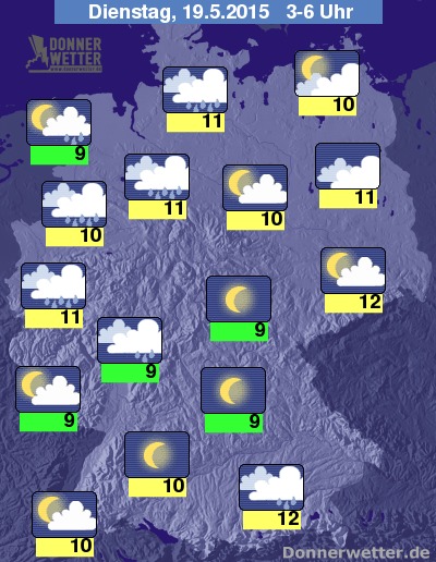 In der kommenden Nacht bleibt es über der Nordwesthälfte von Deutschland stark bewölkt oder bedeckt und es fällt zeitweise, zum Teil auch langanhaltender Regen. Am Alpenrand und am Bayerischen Wald sind bei oft dichten Wolken zeitweise Schauer möglich, im übrigen Bundesgebiet ist der Himmel oft aufgelockert bewölkt, vor allem im Süden aber auch verbreitet sternenklar und es bleibt trocken. Die Temperatur sinkt auf 12 Grad in Passau und bis 9 Grad am Pfälzer Wald.