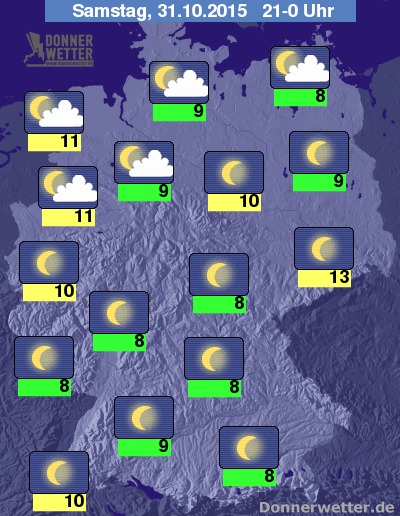 Am heutigen Helloweenabend steht allen Freunden des schaurigen Gruselns und deren Kostümen wettertechnisch nichts im Wege, denn allenfalls über dem Norden und Nordwesten des Landes hält sich öfters eine lockere Bewölkung, im übrigen Bundesgebiet zeigt sich der Himmel hingegen verbreitet sternenklar, dabei bleibt es landesweit trocken. Die Abendtemperatur liegt bei 13 Grad in Dresden und um 8 Grad am Odenwald.