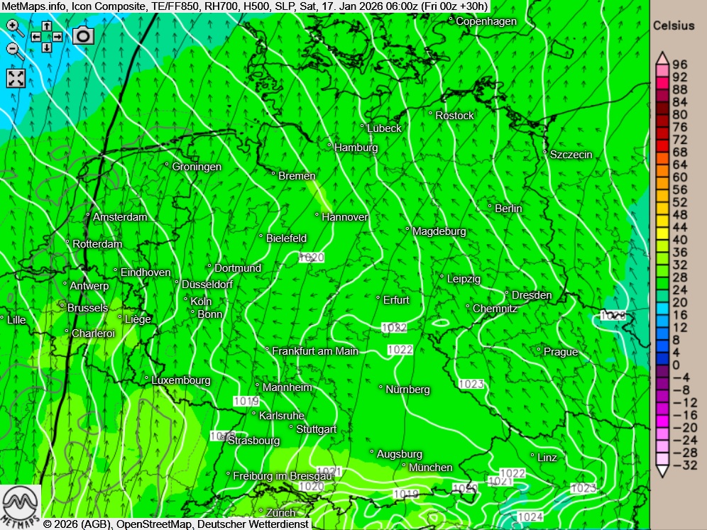 Die Wetter- / Temperatur und Strömungskarte für Samstagfrüh (06:00 Uhr) nach ICON: