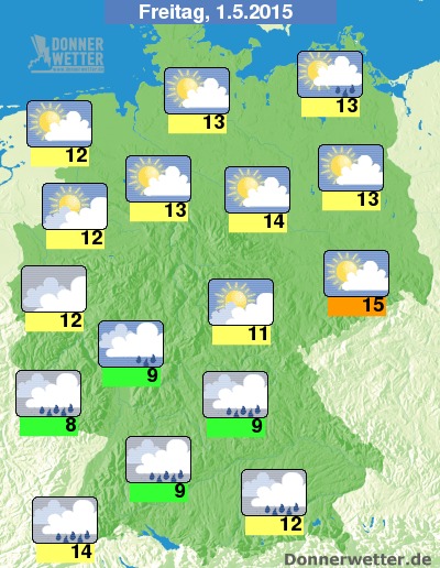 Am heutigen 1. Mai bleibt es über der Südhälfte Deutschlands bei weitgehend dichten Wolken und im Süden selbst fällt zeitweise, und hierbei besonders am Alpenrand teils langanhaltender und auch ergiebiger Regen. In den nördlicher gelegenen Landesteilen scheint hingegen zu Beginn häufig die Sonne, im Tagesverlauf ziehen aber auch hier zunehmend Wolken auf, dabei bilden sich im Ostseeumfeld einige Schauer, sonst bleibt es hingegen trocken. Die Temperatur steigt auf teils nur 8 Grad am Pfälzer Wald und bis 15 Grad in der Lausitz.