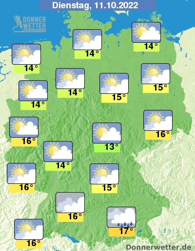 Heute ist es im Süden meist stark, im übrigen Land zum Teil locker, teils jedoch auch stark bewölkt. An den Alpen bilden sich örtliche Schauer, sonst bleibt es weitgehend trocken. Die Temperatur steigt auf 13 Grad im Vogtland und bis 17 Grad in Berchtesgaden.