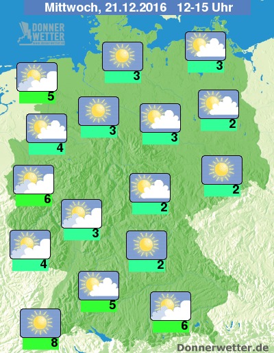 Am Nachmittag kann sich die Sonne auch im Westen Deutschlands zunehmend durchsetzten. Überall sonst im Land ebenfalls viel Sonnenschein bei leichter Bewölkung. An der Weser im Norden weiterhin ein wolkenfreier Himmel, an der Nordsee teils bedeckter Himmel.