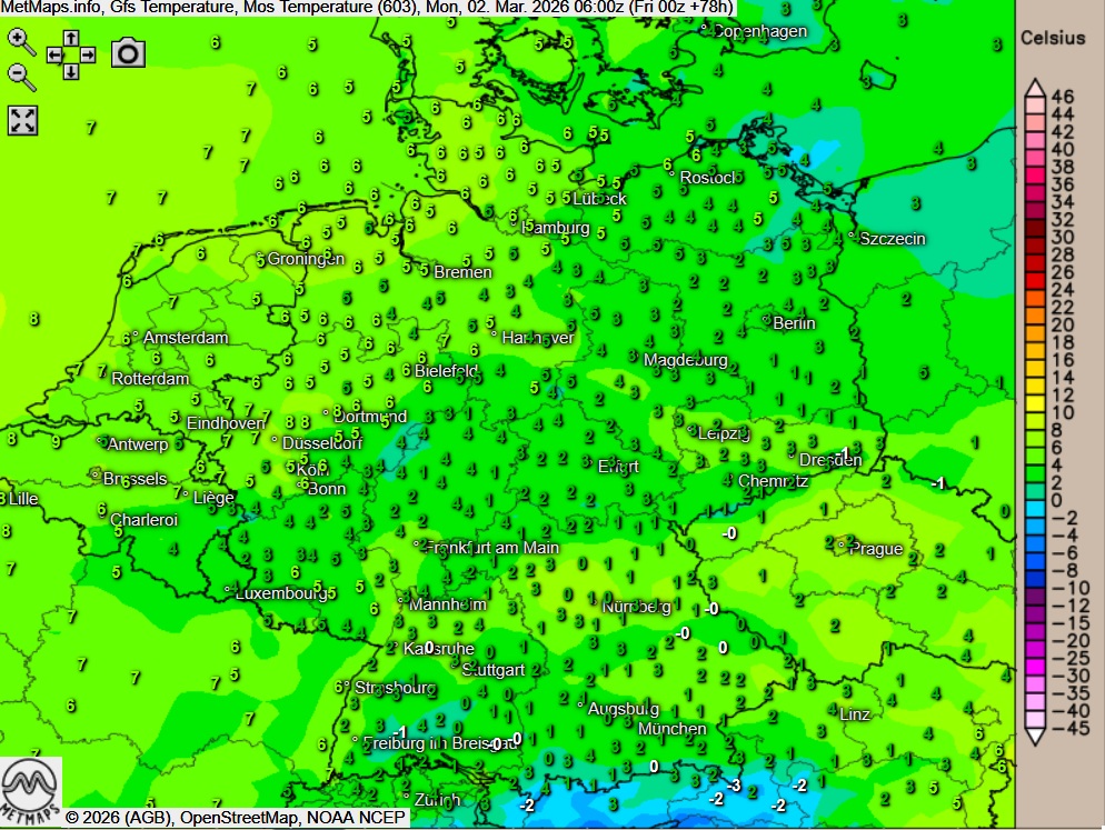 Die Wetter- und Temperaturkarte sowie die Temperaturabweichung Europa für Montagfrüh (06:00 Uhr) nach GFS:
