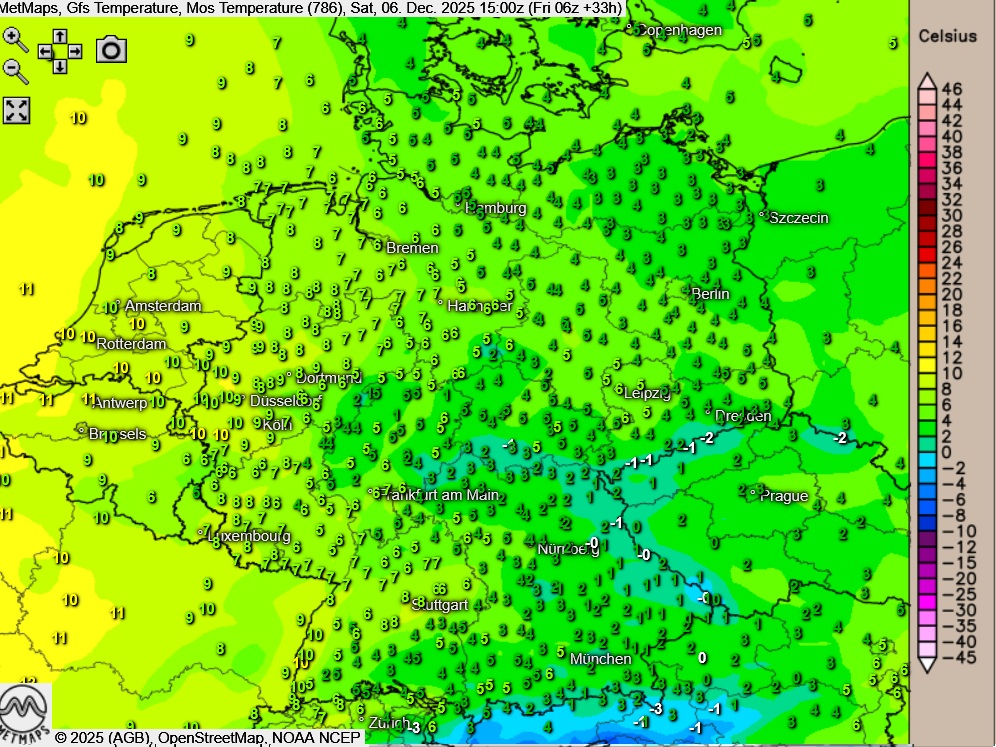 Im Westen gebietsweise bereits Werte um 10 Grad am Nachmittag.