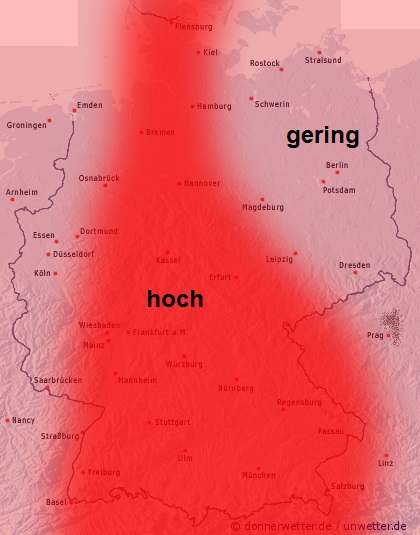 In der bevorstehenden Nacht bleibt es in der Osthälfte bis zum Morgen noch meist leicht oder aufgelockert bewölkt und trocken. Weiter nach Westen hin zieht hingegen oft starke Bewölkung durch und es können sich verbreitet Schauer und gebietsweise Gewitter entwickeln. Die Temperatur sinkt auf tropische 21 Grad in Aachen und etwa 15 Grad an der Müritz.