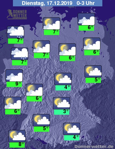 In der Nacht auf Dienstag zeigt sich der Himmel zunächst überwiegend locker oder aufgelockert bewölkt und es bleibt trocken. Nur im äußersten Westen und Nordwesten sowie an der Ostseeküste bleibt die Wolkendecke zumeist geschlossen und einzelne Schauer sind möglich.