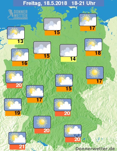 Heute Abend halten sich vor allem über dem Norden weiterhin oft dichte Wolken, zum Teil und vor allem in den küstennahen Regionen ist es aber auch häufig locker bis aufgelockert bewölkt. Von der breiten Landesmitte bis nach Süddeutschland ist es meist heiter bis wechselnd bewölkt, zum Teil auch sehr sonnig. Nur am Alpenrand sind einzelne Schauer möglich, sonst bleibt es landesweit trocken. Die Temperatur liegt bei 13 Grad an der Nordsee und 21 Grad im Oberrheingraben.