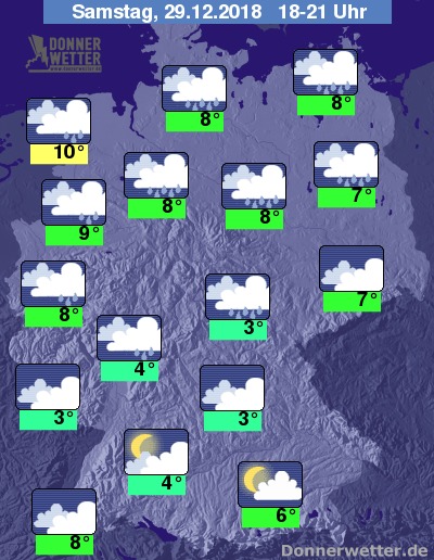 Heute Abend ist es im Süden noch oft aufgelockert bewölkt und trocken, weiter nach Norden hin ist es dagegen bedeckt und es fällt zeitweise Regen. Die Temperatur liegt bei 3 Grad im Grabfeld und bis 10 Grad an der Nordsee.