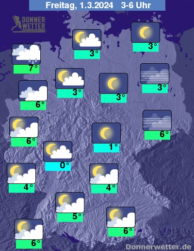 Die Temperaturen erreichen Höchstwerte um 6 Grad in Ostfriesland, 10 Grad an der Ostseeküste und um 13 Grad am Alpenrand.
