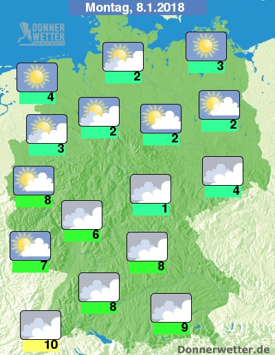 Heute scheint im Norden häufig die Sonne, oft ist es hier sogar wolkenlos. Weiter nach Süden hin bleiben die Wolken hingegen meist dicht, Regen ist aber auch hier nicht zu erwarten. Vor allem westlich des Rheins lockert die Bewölkung auch vielerorts auf. Die Temperatur erreicht nur 1 Grad im Thüringer Becken und bis 10 Grad im Breisgau.