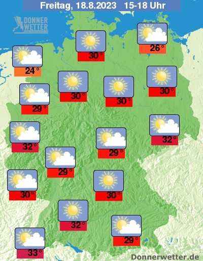 Am Nachmittag scheint die Sonne über weiten Landesteilen von einem wolkenlosen Himmel oder es ist heiter; vornehmlich in der Nordosthälfte können die Wolken am Nachmittag zeitweise auch mal dichter sein, einzelne Schauer und Gewitter sind nicht ausgeschlossen. In den übrigen Landesteilen bleibt es niederschlagsfrei.