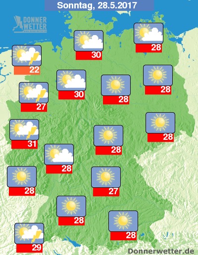 Am Sonntag bleibt es über Deutschland weiterhin größtenteils sonnig und trocken. Besonders von NRW bis ins westliche Niedersachsen bilden sich im Tagesverlauf oft dichte Quellwolken, die gebietsweise zu Schauern und örtlich auch kräftigen Gewittern führen können.Ein mäßiges Schauer- und Gewitterrisiko besteht auch rund um den Schwarzwald. Die Temperatur erreicht angenehme 22 Grad an der Nordsee und teils schwülheiße 31 Grad in Köln.