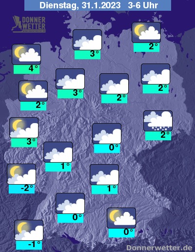 In der Nacht zum Dienstag ist es in den westlichen und nördlichen Landesteilen oft locker bis aufgelockert bewölkt und trocken. Im übrigen Land bleiben die Wolken meist dicht und über Bayern, vor allem aber über Sachsen fällt häufig Schnee oder Schneeregen. Im übrigen Bundesgebiet bleibt es weitgehend trocken. Die Temperatur sinkt auf 4 Grad an der Nordsee und bis -2 Grad am Pfälzer Wald. An den Küsten und auf den Bergen der Norddeutschen Mittelgebirge weht ein oft stürmischer Wind.