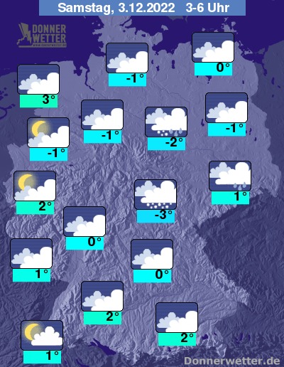 In der kommenden Nacht fällt von der Mitte des Landes bis in den Osten gebietsweise Schnee, zum Teil auch Schneeregen oder Regen. Hier ist verbreitet mit glatten Straßen durch Schnee oder überfrierender Nässe zu rechnen!! Im übrigen Land ist es ebenfalls meist bedeckt und nur selten zeigen sich Auflockerungen, dazu bleibt es trocken. Stellenweise bildet sich Nebel. Die Temperatur sinkt auf 3 Grad in Bremerhaven und -3 Grad in Jena.