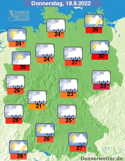 Am Donnerstag ist es im Süden oft heiter und trocken. Im übrigen Land ist es aufgelockert bis stark bewölkt und es bilden sich wiederholt, teils kräftige Schauer, lokal entwickeln sich auch Gewitter. Die Temperatur erreicht etwa 21 Grad am Westerwald und bis 33 Grad in der Lausitz.