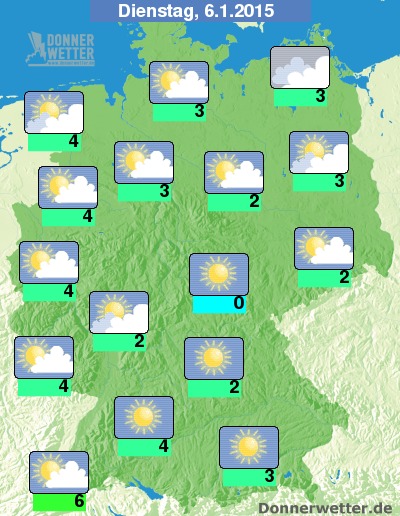 Am Dienstag bleibt es im äußeren Norden, im Nordosten sowie im Osten oft stark bewölkt oder trüb, dazu jedoch weitgehend trocken, sonst kann sich dagegen verbreitet die Sonne zwischen meist nur lockeren Wolkenfeldern zeigen. Am sonnigsten wird es voraussichtlich vom Süden bis in die Mitte Deutschlands. Die Temperatur steigt auf 0 Grad im Grabfeld und bis 6 Grad im Breisgau.