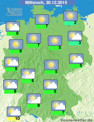Am Mittwoch ist es im Südwesten Deutschlands häufig stark bewölkt oder trüb, jedoch weitgehend trocken. Im großen Rest des Landes ist es dagegen verbreitet heiter bis sonnig, insbesonders über der Nordhälfte zeigt sich der Himmel über weite Strecken wolkenfrei. Die Temperatur steigt auf nur noch 2 Grad an der Müritz und bis 10 Grad im Breisgau. An Nord- und Ostsee weht ein teils starker Wind.