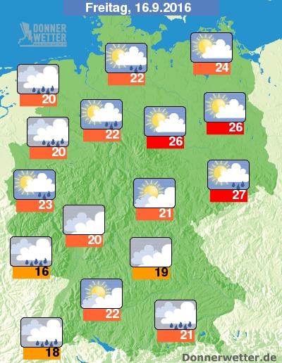 Am Freitag ist es meist locker bis aufgelockert, gebietsweise aber auch stark bewölkt, dazu bilden sich örtliche Schauer, hier und da sind auch Gewitter möglich. Die Temperatur steigt auf frische 16 Grad am Pfälzer Wald und bis auf 27 Grad in der Lausitz.