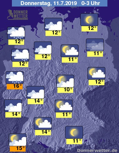 In der Nacht zeigt sich der Himmel in der Nordwesthälfte stark bewölkt oder bedeckt und immer wieder muss mit Schauern gerechnet werden. Im Süden dominiert zunächst noch lockere Bewölkung, bevor im Nachtverlauf die Bewölkung auch hier zunimmt. Im Osten bleibt es bei meist lockerer Bewölkung.