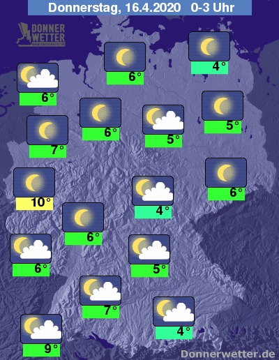 Die Temperaturen sinken im Nachtverlauf auf Werte um 8 Grad in der Kölner Bucht und um 3 Grad am Alpenrand.
