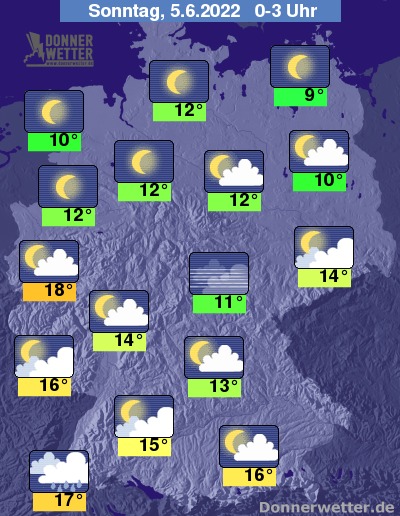 In der Nacht auf Sonntag bleibt der Himmel über dem Norden und Osten des Landes gering bewölkt oder die Sterne funkeln von einem wolkenlosen Himmel. In den südlichen Landesteilen bleibt es bei einem Mix aus lockerer und aufgelockerter Bewölkung weitgehend niederschlagsfrei, einzelne schauerartige Regenfälle und lokale Gewitter beschränken sich auf den Südwesten Deutschlands.