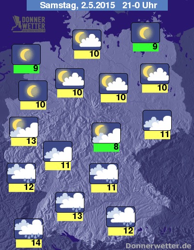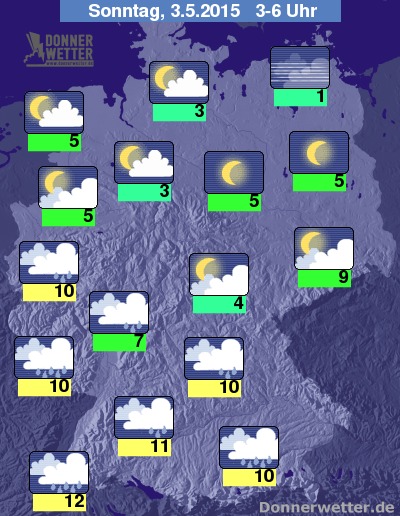 In der Nacht zum Sonntag fällt im Süden und Südwesten bereits verbreitet, teils langanhaltender Regen, bis zum Morgen breitet sich das Regengebiet etwa über die Südwesthälfte des Landes hin aus. Nordöstlich an das Regengebiet anschließend ist es ebenfalls stark bewölkt, aber noch trocken. Im Norden und Osten der Bundesrepublik ist es zunächst weitgehend sternenklar, gegen Morgen ziehen hier auch teils einige Wolken auf, dazu bleibt es aber trocken. Die Temperatur sinkt auf 12 Grad im Breisgau und bis 1 Grad an der Müritz.