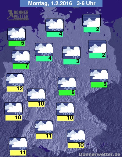 In der Nacht zum Montag bleibt es bedeckt, dabei ist es im Nordosten weitgehend trocken, sonst fällt dagegen häufig und teils auch langanhaltender Regen, am Alpenrand ist der Regen oft ergiebig. Die Temperatur sinkt auf 12 Grad in Köln und bis 2 Grad an der Müritz. Im Süden und Westen weht starker und teils stürmischer Wind.