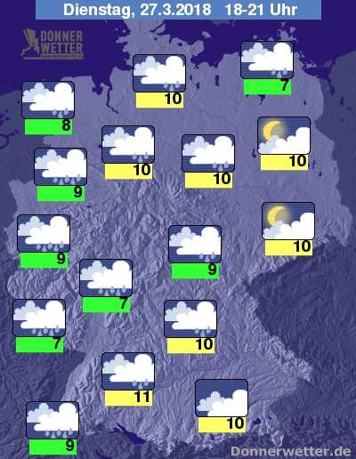 Heute Abend sind im Osten noch Auflockerungen möglich, dabei ist es hier weitgehend trocken, sonst ziehen dagegen verbreitet dichte Wolken durch und es fällt zeitweise Regen. Die Temperatur liegt bei recht milden 7 bis 11 Grad.
