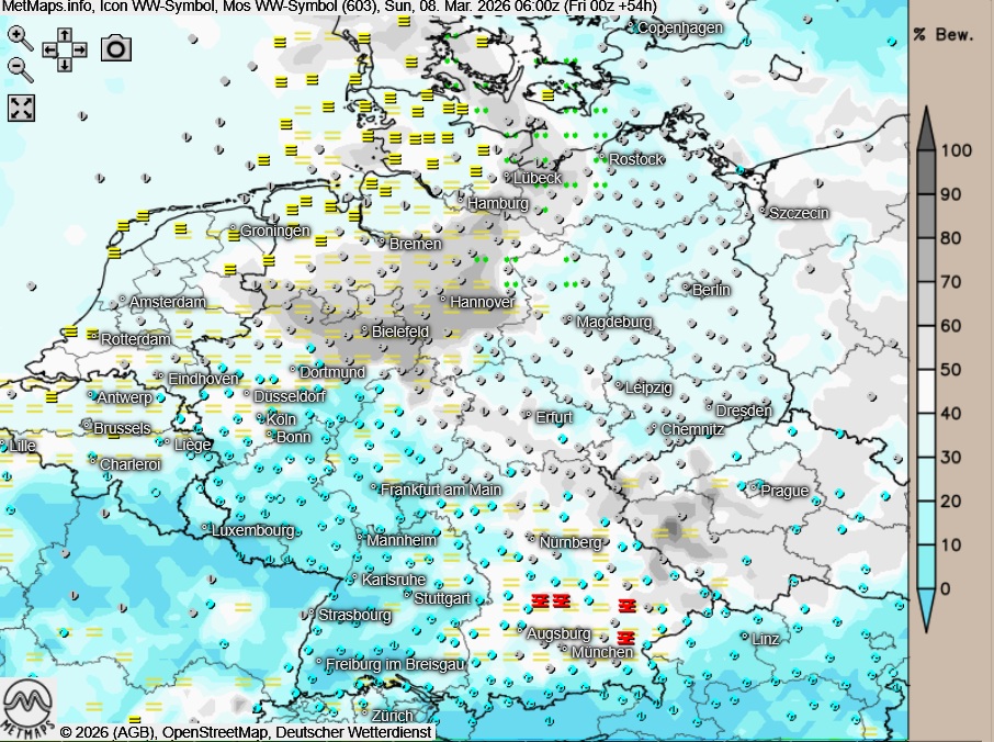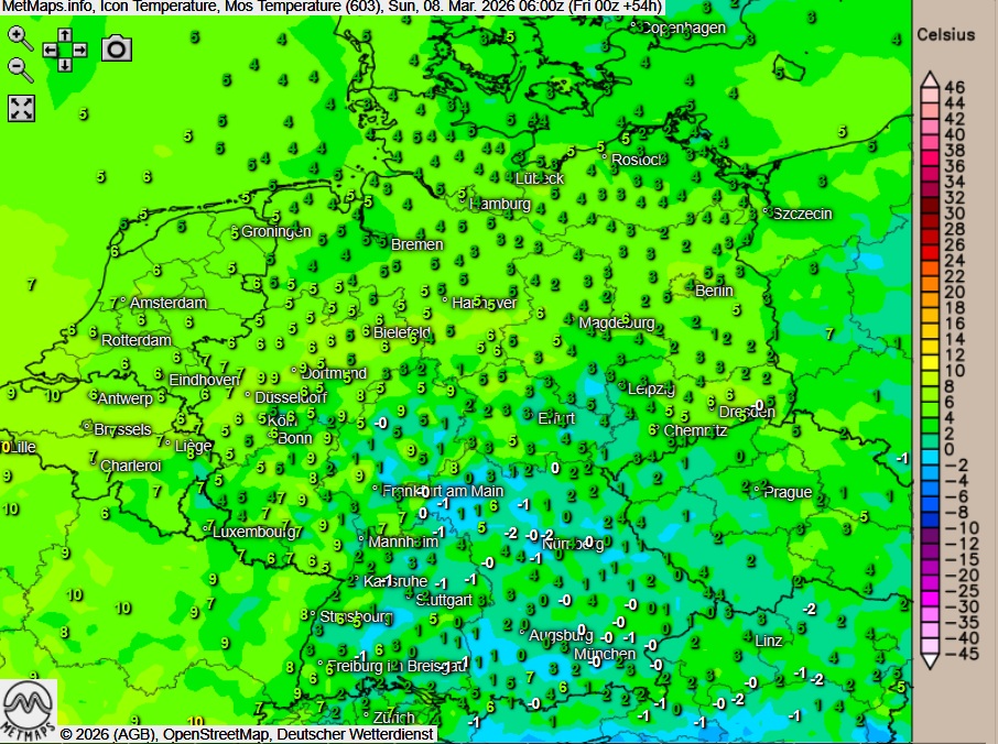 Die Temperatur- und Wetterkarte für Sonntagfrüh (06:00 Uhr) nach ICON: