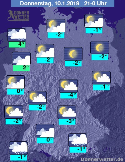 Die Luft kühlt bis zu den Frühstunden auf frostige -7 bis 0 Grad ab. Über Schneeflächen kann es bei aufklarendem Himmel noch kälter werden. Lediglich in den Ballungsgebieten des Westen, sowie im westlichen Niedersachsen bleibt es in der Regel frostfrei.