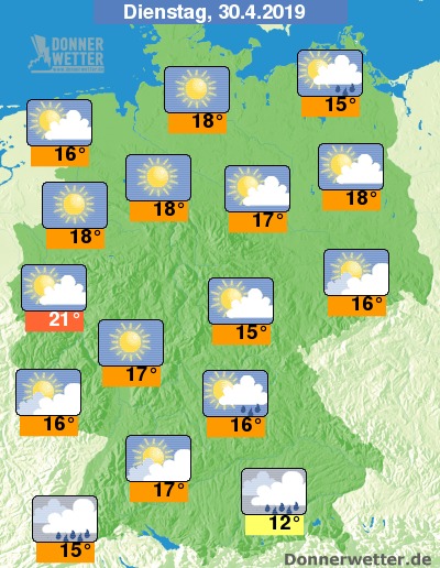 Der Dienstag fällt meist sehr schön aus, ausser an der Ostseeküste und im Süden beim Schwarzwald und Oberbayern sind teils Niederschläge zu erwarten. Die Sonne zeigt sich vermehrt im Norden. Im Übrigen, ist es meist locker oder aufgelockert bewölkt, mit Temperaturen bis zu 21 Grad.