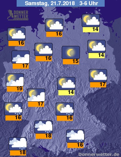 Am Samstag ist es über dem Norden überwiegend heiter, teil sonnig, teils aber auch aufgelockert bewölkt, jedoch trocken. Über die Südhälfte der Republik ziehen immer wieder auch dichte Quellwolken durch, die hier für zum Teil kräftige Schauer und Gewitter sorgen, dazwischen scheint aber auch vielerorts die Sonne. Die Temperatur erreicht 22 Grad am Oberrhein und bis 31 Grad in der Kölner Bucht.