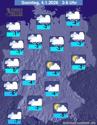 In der Nacht zum Sonntag ziehen besonders über die Nordhälfte dichte Wolken mit weiteren Schnee- oder Schneeregenfällen. In den übrigen Landesteilen ist es teils stark, teils auch wechselnd bewölkt und es fällt seltener Schnee. Die Temperatur sinkt auf 0 Grad im Rheinland und bis -7 Grad im Oberrheingraben.